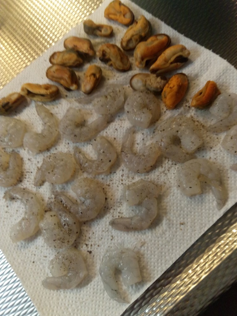Voor het bierbeslag: 400 gr mosselen en 400 gr garnalen (of hoeveel je zelf wilt), 200 gr bloem type 00, 100 ml bier (lijkt weinig, maar is ruim voldoende. Het beslag moet een beetje dik blijven), 150 ml koud water (mag ook koolzuurhoudend zijn), zout, peper, plantaardige olie (zonnebloemolie) om te frituren, partjes citroen om te serveren