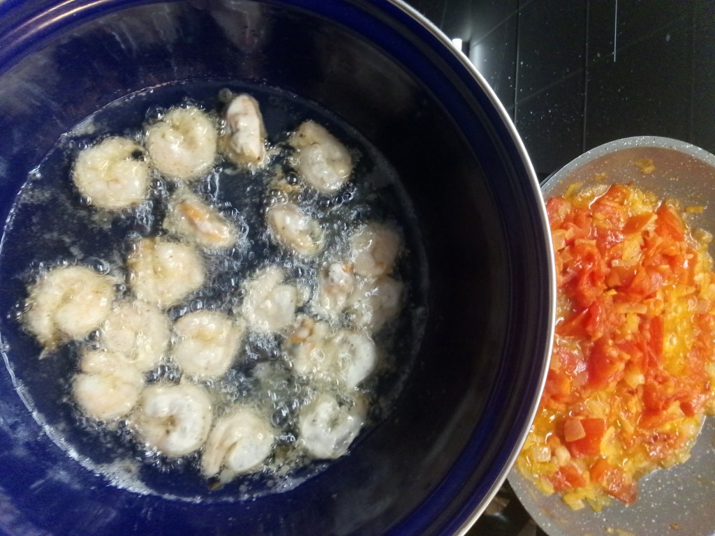 Giet de plantaardige olie in een braadpan tot een laag van ongeveer 8 cm erin staat. Verhit de olie tot een stukje beslag dat je erin laat vallen gaat bruisen en snel goudbruin kleurt. Haal de mosselen en garnalen door het beslag en laat ze direct in de hete olie zakken met hun voetjes. Vinden ze lekker! Bak ongeveer 10 stuks per keer, 3 min aan beide kanten, tot ze krokant zijn, laat ze niet verbranden. Bak er niet teveel tegelijk, want dan worden ze niet goed gaar. Herhaal totdat alles gebakken is. Kook nu de spaghetti, want je bent bijna klaar.