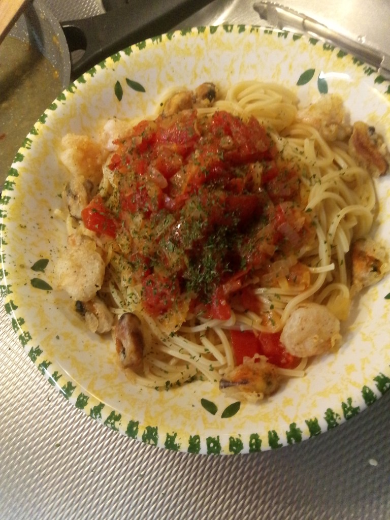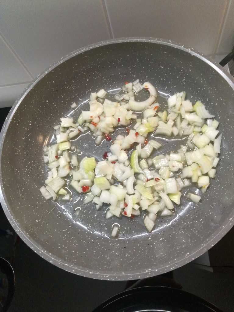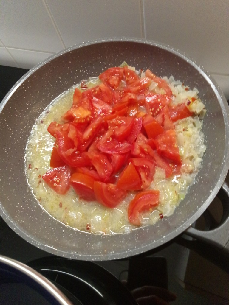 We gebruiken voor dit recept ingevroren garnalen en mosselen. Deze moeten nog even wachten. We gaan eerst de saus maken. Snij de tomaten in grove stukken. Snijd de ui in stukjes en bak in een beetje olie in een koekenpan aan. Voeg de gesneden chilipeper toe. Giet de wijn erbij en laat even pruttelen. Voeg nu de tomaat erbij en laat zachtjes de saus pruttelen op laag vuur. Zet ondertussen een pan water op voor de spaghetti.