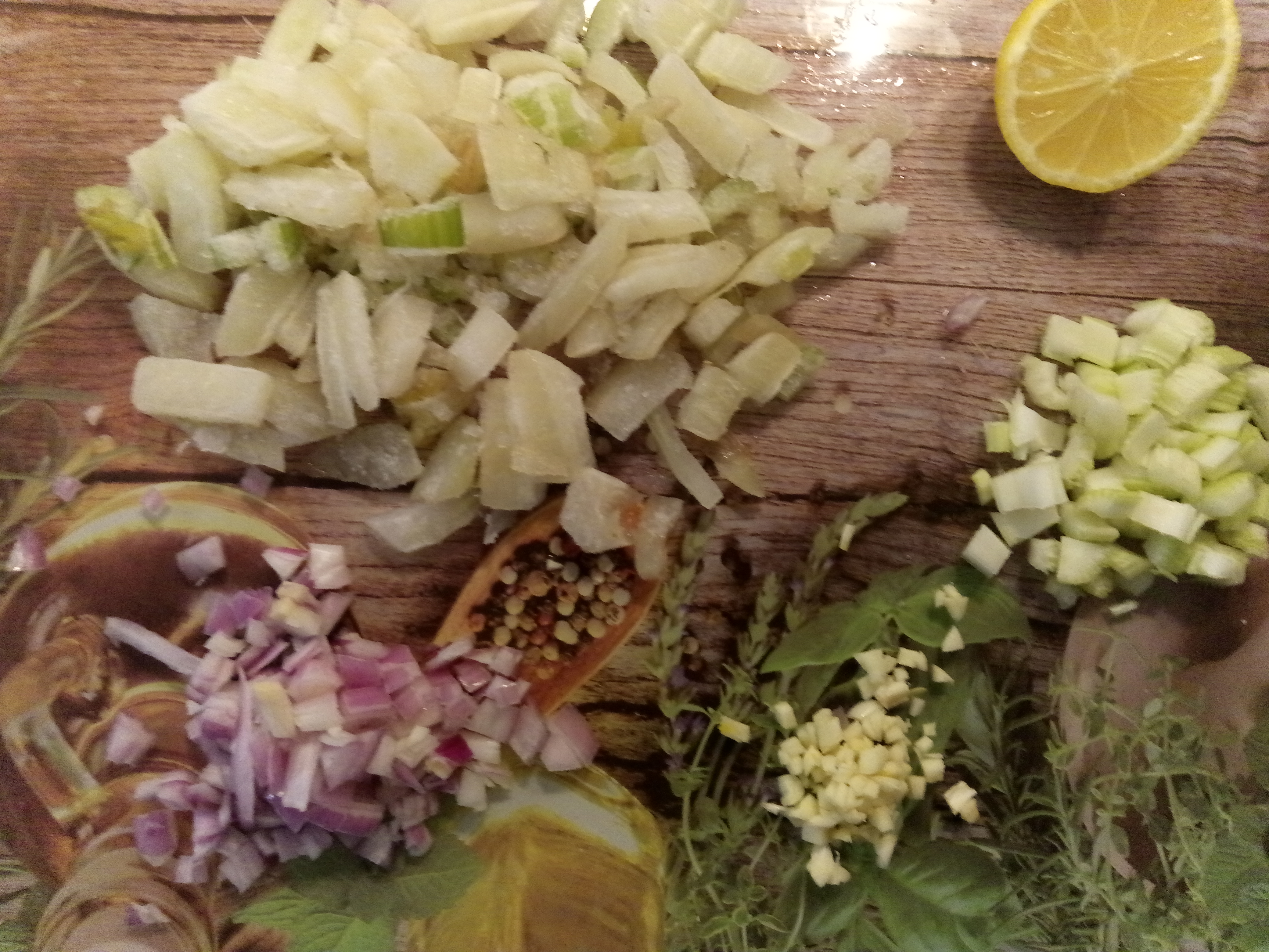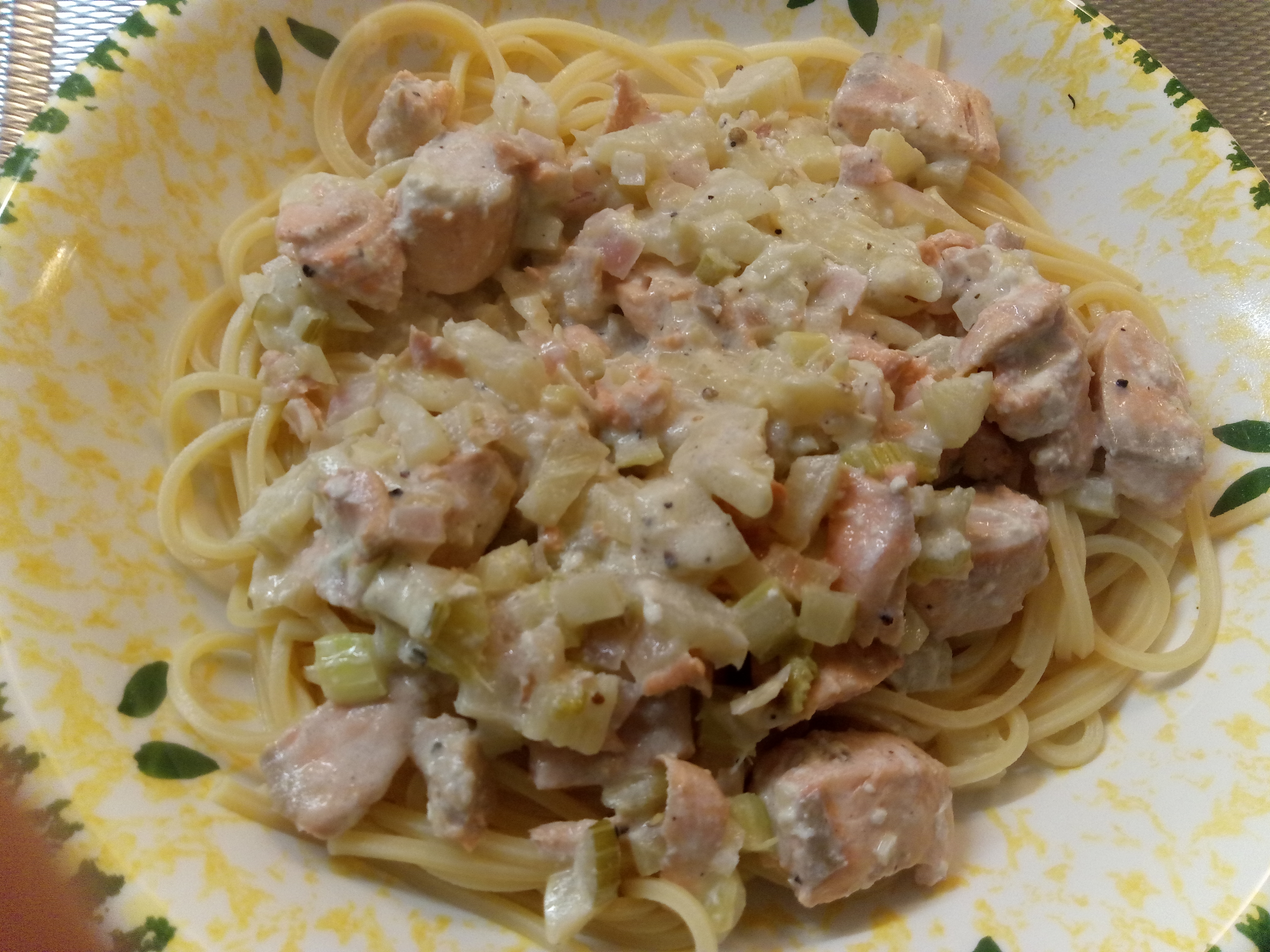 300 gr Spaghetti, 1 sjalotje, 2 knoflook, 1 kleine venkel, 1 stengel bleekselderij, 100 ml witte wijn, ½ citroensap, 250 ml room, 350 gr verse zalm, zout, peper