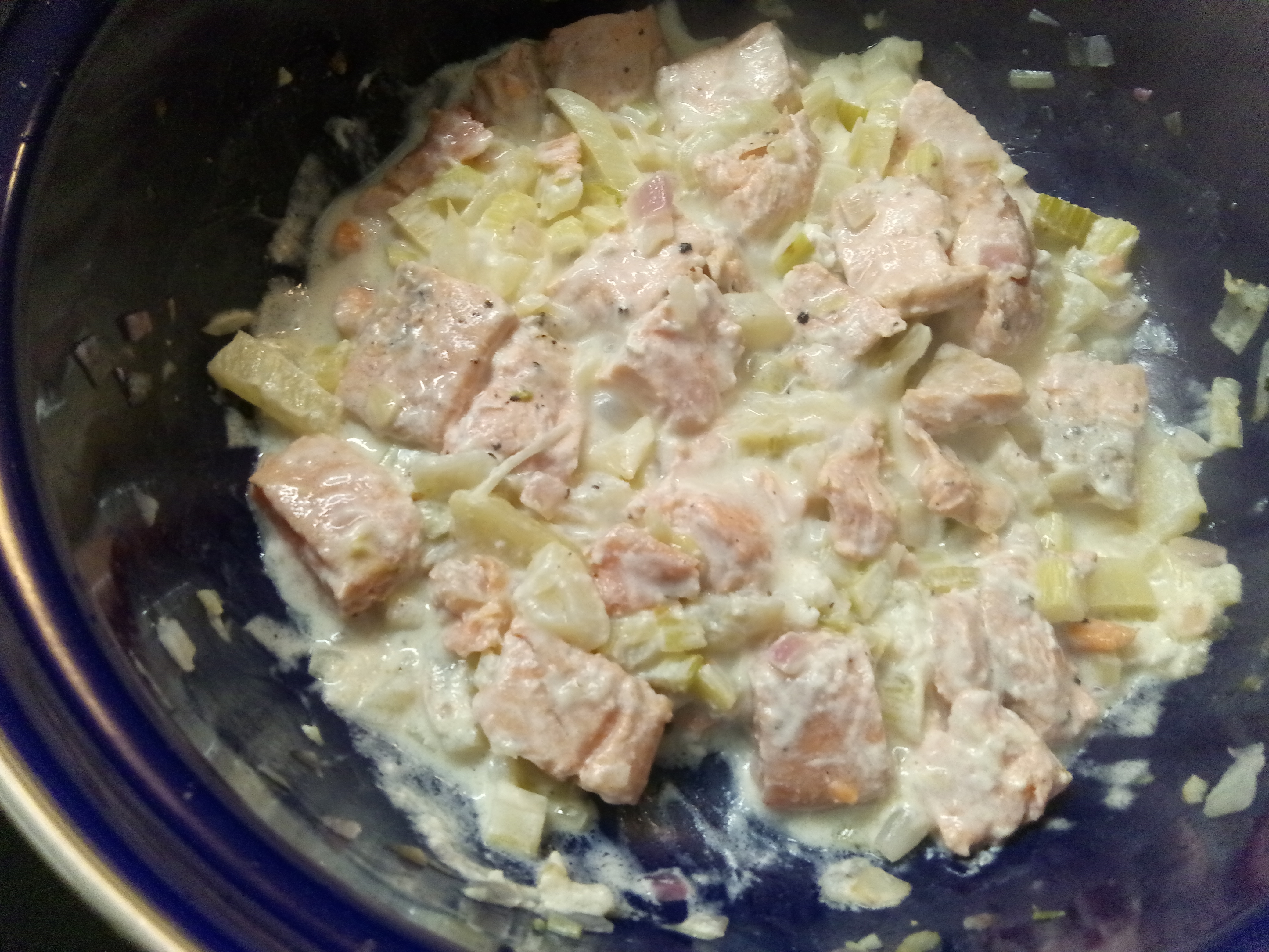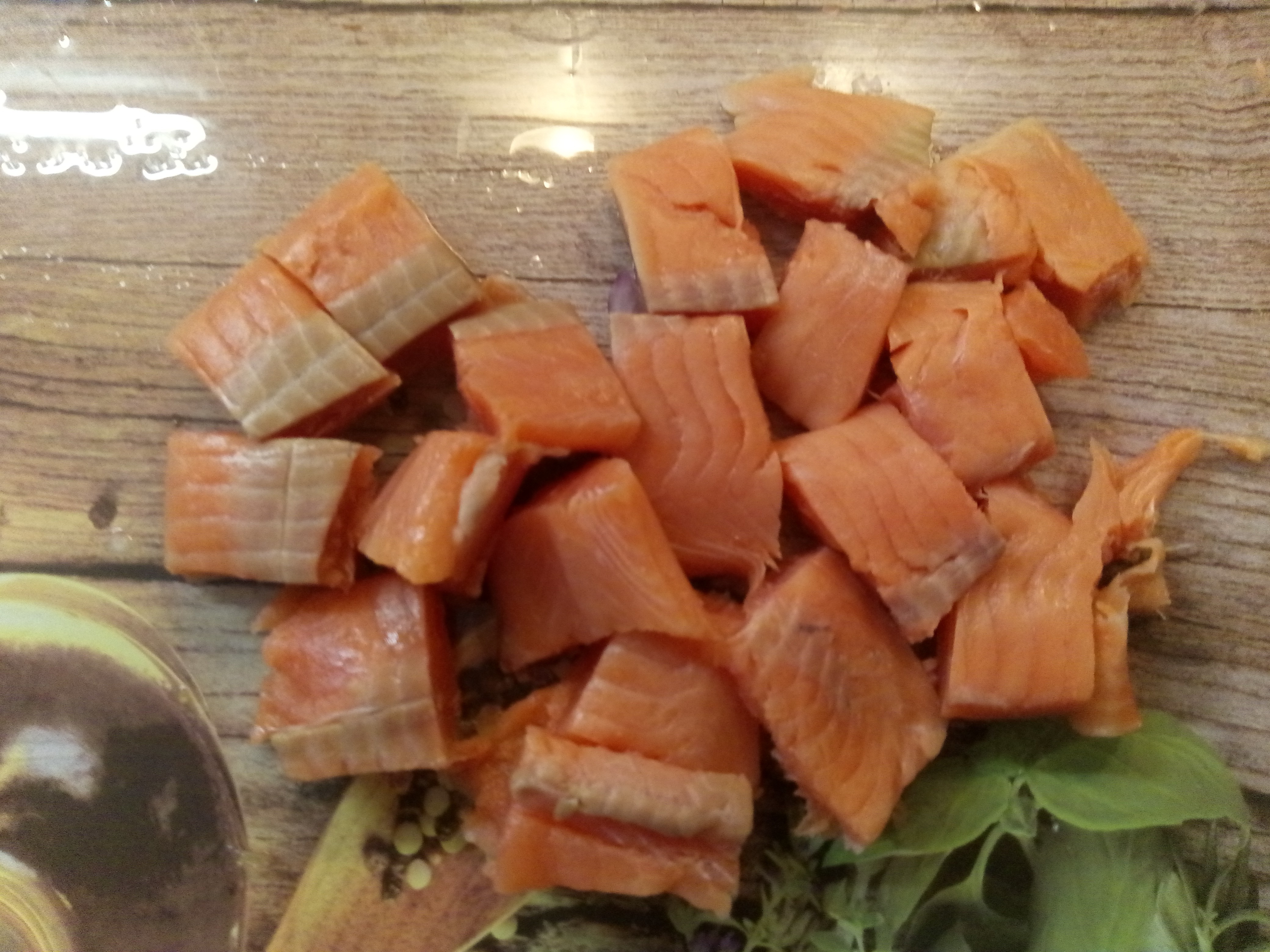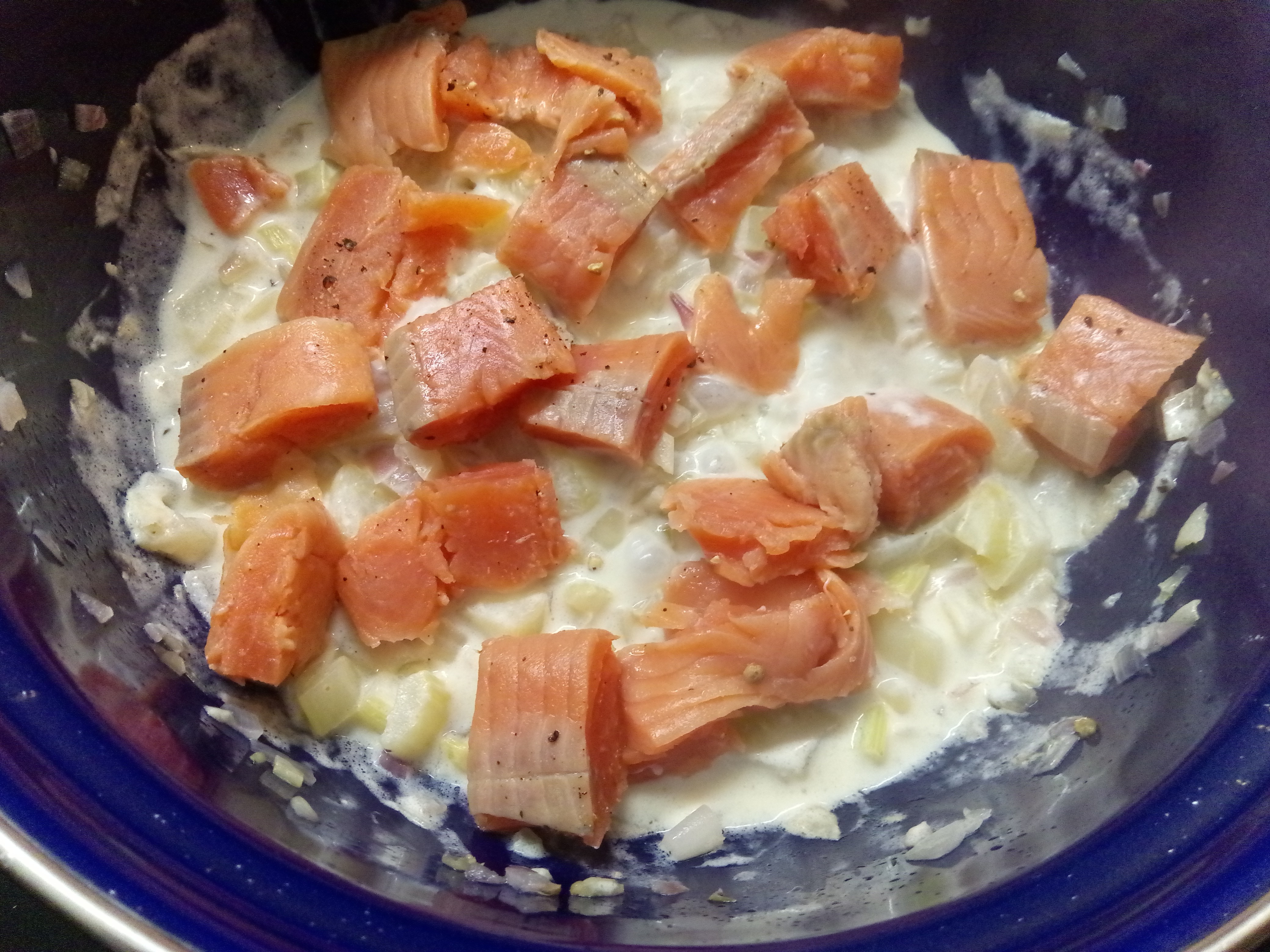 Tip: je kan de zalm ook eerst grillen, blus af met Brandy en dan in stukken of in zijn geheel bij de spaghetti en saus doen.