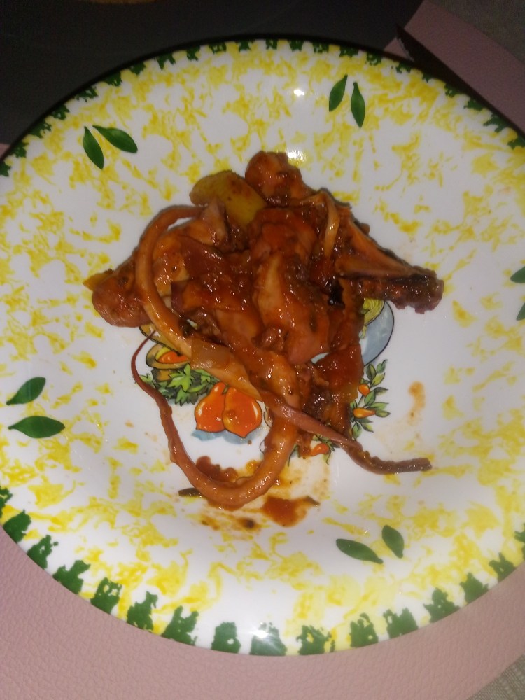 Doe de uien, knoflook en ansjovis in een braadpan en laat zachtjes smoren. Dan doen we de bleekselderij, wortel in plakjes en rode peper in ringen erbij, de Italiaanse kruiden , peper en zout ook erbij. Vuur hoger zetten. Zout en zwarte peper erbij. Daarna één glas witte wijn erbij en blokje visbouillon erbij (of de brodo die je nog in de diepvries hebt) lekker laten pruttelen totdat de wijn verdampt is. Verse tomaten en blik tomaten mogen er ook in en nog één glas witte wijn erbij. Platpeterselie erin, vuur laag zetten. Rustig laten pruttelen. Polpo in stukken van 1 of twee cm snijden, bij een goede viszaak of op de markt kan je heerlijke en betaalbare octopus (geen inktvis) kopen. Polpo stukjes in de saus met hun voetjes in de saus laten glijden (wees lief voor hem) en drie tot vier uur laten pruttelen (proef af en toe de polpo of hij al gaar is, regelmatig roeren en 2 glazen witte wijn erbij doen, vind de polpo lekker. Als het te nat is vuur hoger zetten om in te laten koken. 10 minuten voordat de Polpo gaar is de spaghetti al dente koken en verder mee laten koken met de saus. Extra vergine olijfolie erbij doen en peterselie on top. Fantastico!