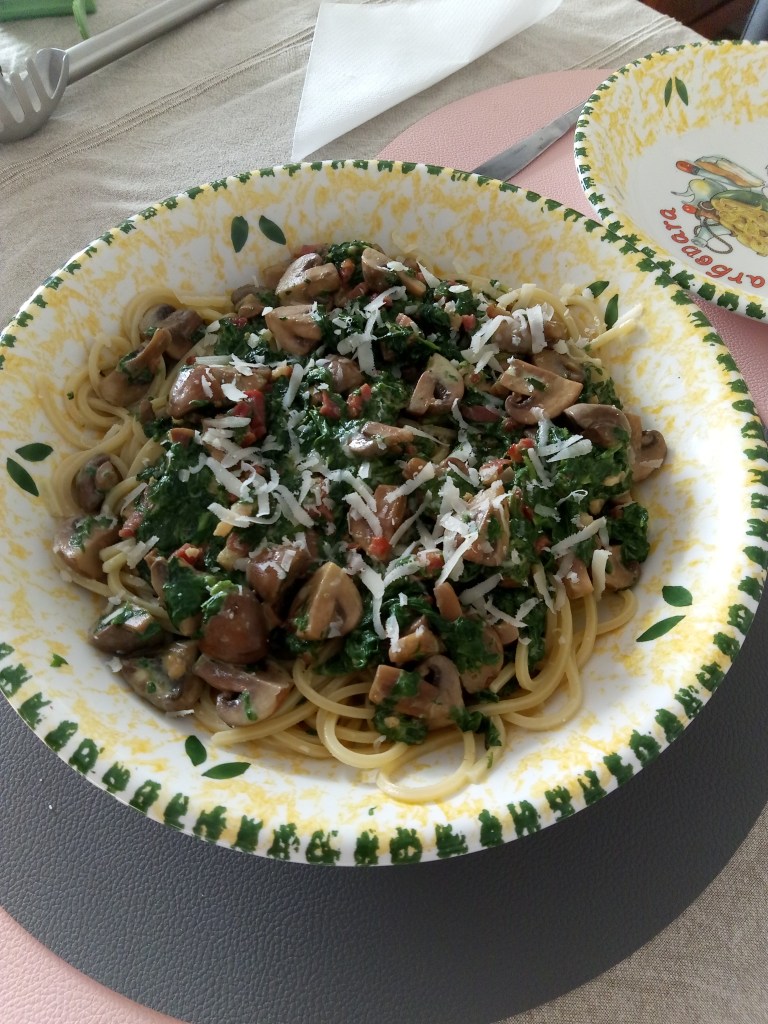 375 gr spaghetti (deze keer nemen we een dunnere variant van Armando, te koop bij Plus), 1 bakje spekblokjes, 400 gr spinazie, 1 bakje van 250 gr kastanjechampignons, 250 ml room, 1 bakje Grana Padano, peper, zout, extra vergine olijfolie