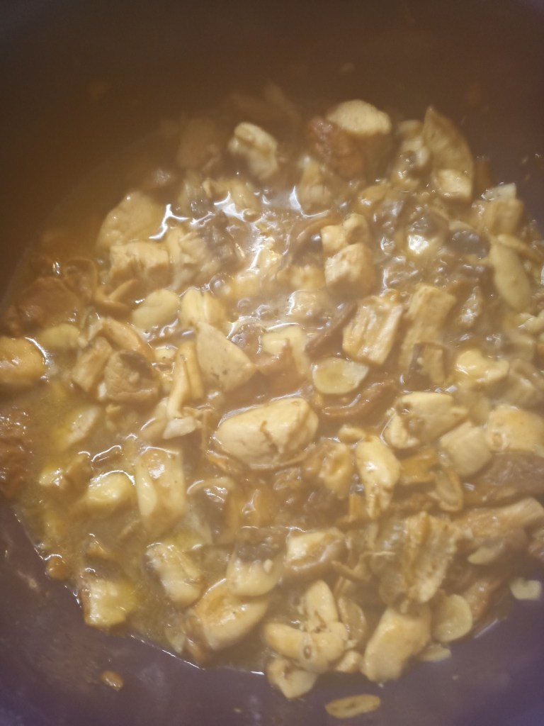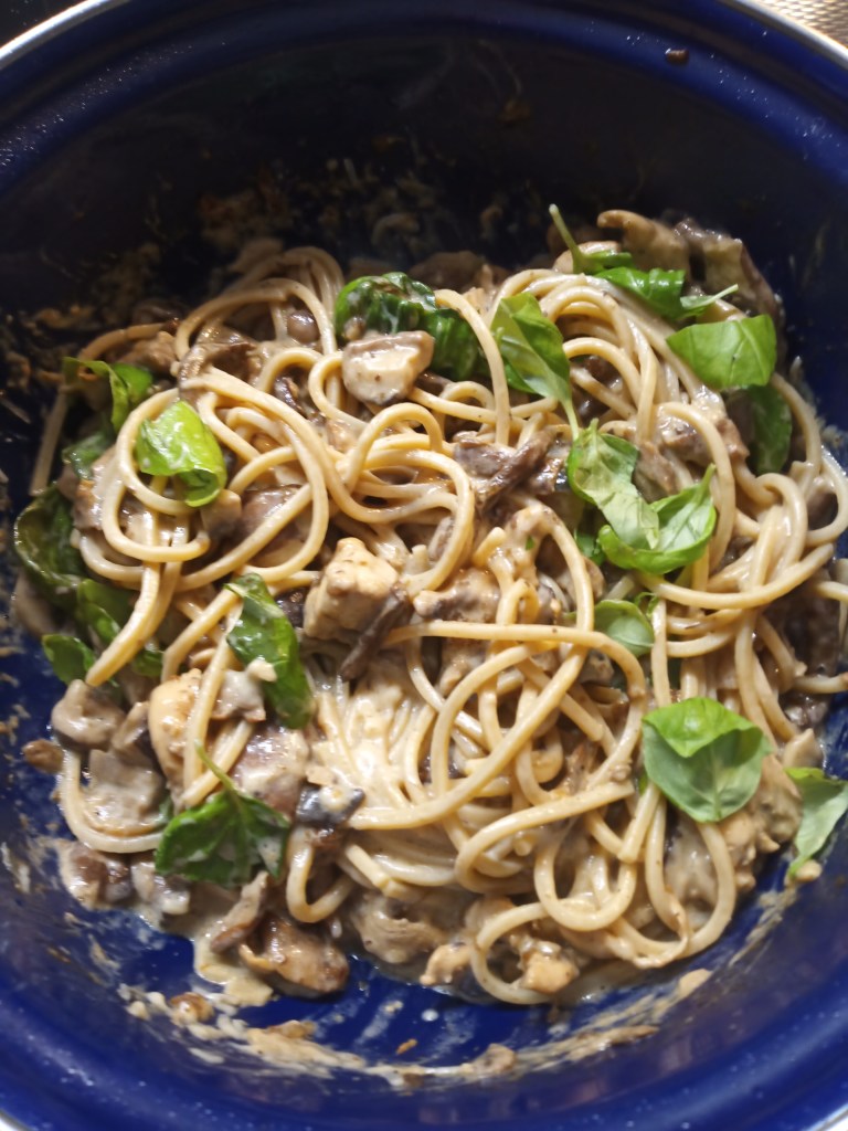 150 gr spaghetti, 1 pakje gedroogde porcini (eekhoorntjesbrood), 100 gr kipfilet (of 1 kippenbout, ontbeend, ontveld en in hapklare stukjes gesneden), 2 knoflook gepeld en in dunne plakjes gesneden, 1 bakje gemengde verse paddenstoelen schoongemaakt en in stukken gescheurd, 2 dl witte wijn, 5 dl slagroom, Parmezaan, een takje verse basilicum alleen de blaadjes, zout, zwarte peper
