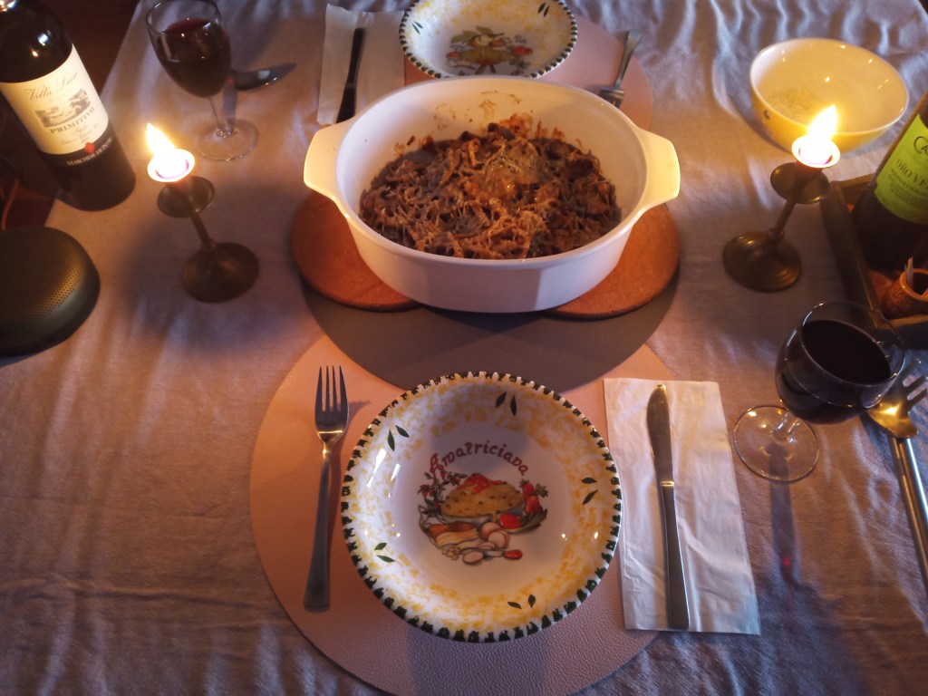 Kook ondertussen de spaghetti in een ruime hoeveelheid water gaar volgens de aanwijzingen op de verpakking en doe er een scheut olijfolie en zout bij, giet de pasta af. Doe ondertussen de room in de pan met de saus, laat de saus tot tegen de kook aan komen en zet het vuur uit. Breng de saus op smaak met royaal zout en zwarte peper uit de molen. Doe de uitgelekte spaghetti bij de saus in de pan en doe driekwart van de Parmezaanse kaas en alle basilicum erbij en roer goed.