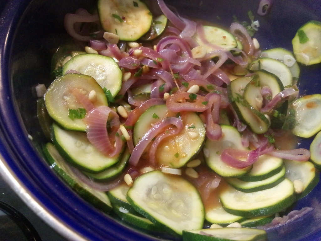 2 uien van Tropea (te koop bij een goede Trattoria, mogen ook andere rode uien zijn), 1 knoflook, 2 middelgrote courgettes, 4 el extra vergine olijfolie, 1 glas droge witte wijn, 1 el tomatenpuree, 20 gr pijnboompitten, 1 handvol verse bladpeterselie (mag ook droge uit de pot), 1 handvol verse basilicum (mag ook droge uit de pot), chilipeper naar smaak, 360 gr Tagliatelle, Parmezaan of Pecorino, zout