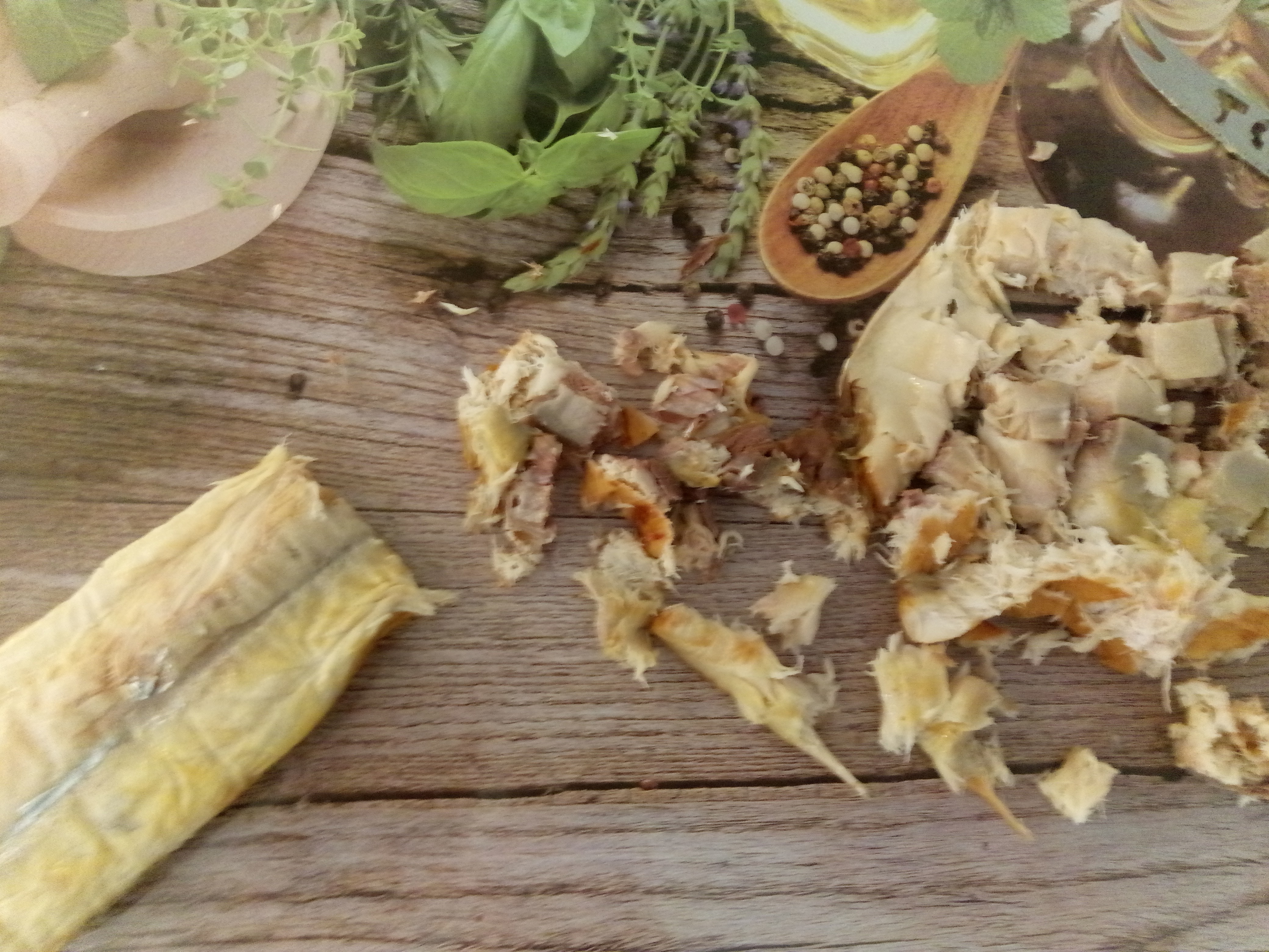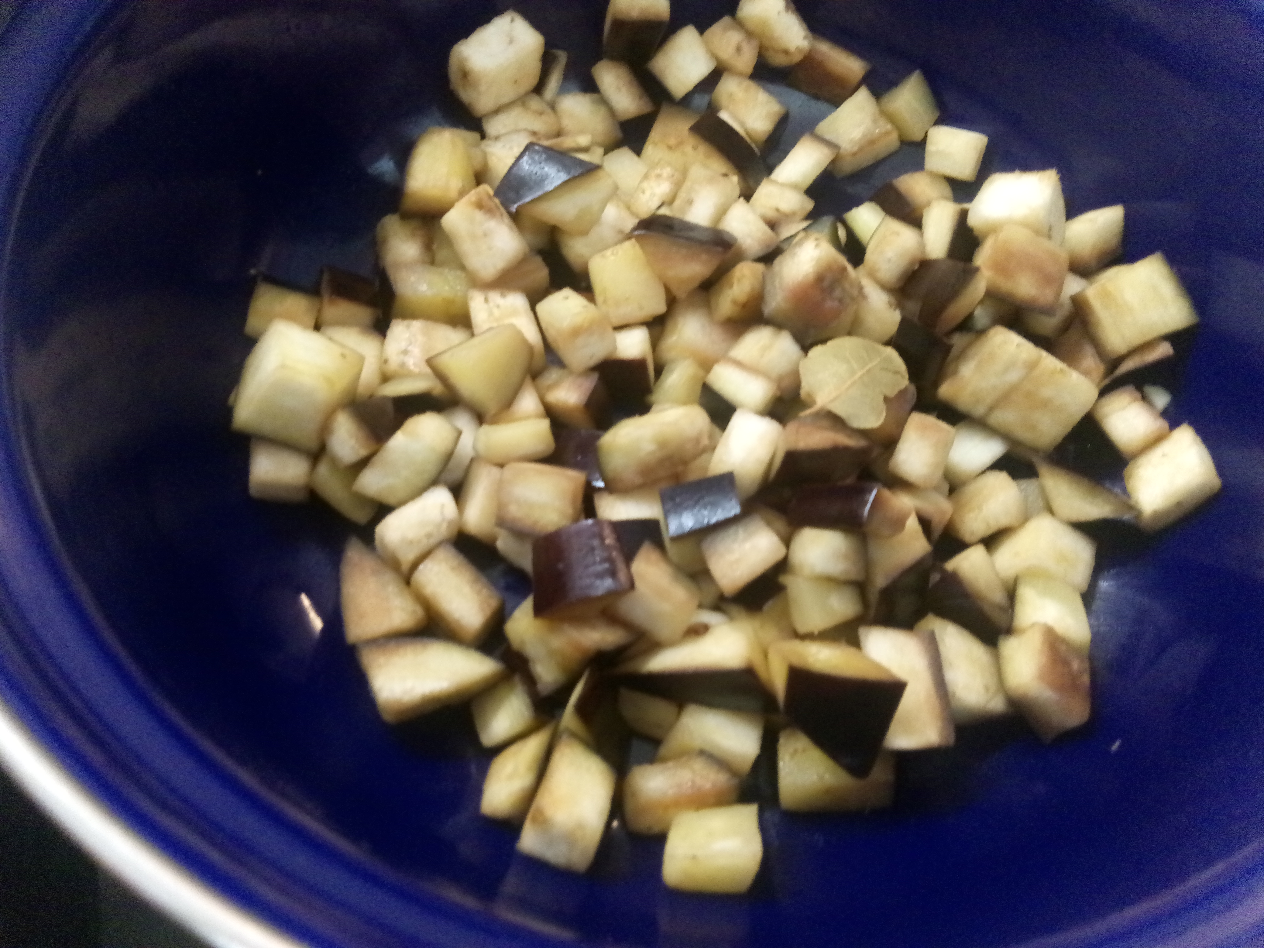 1 kleine aubergine, 1 laurierblaadje, 4 kerstomaten, 1/2 glas witte wijn, 1 knoflook, 2 gerookte makrelen, 1 el kappertjes, 130 gr Taglioni (dunne Tagliatelle), extra vergine olijfolie, zout