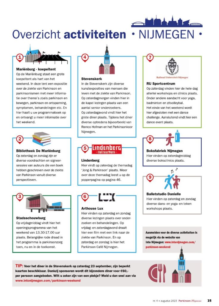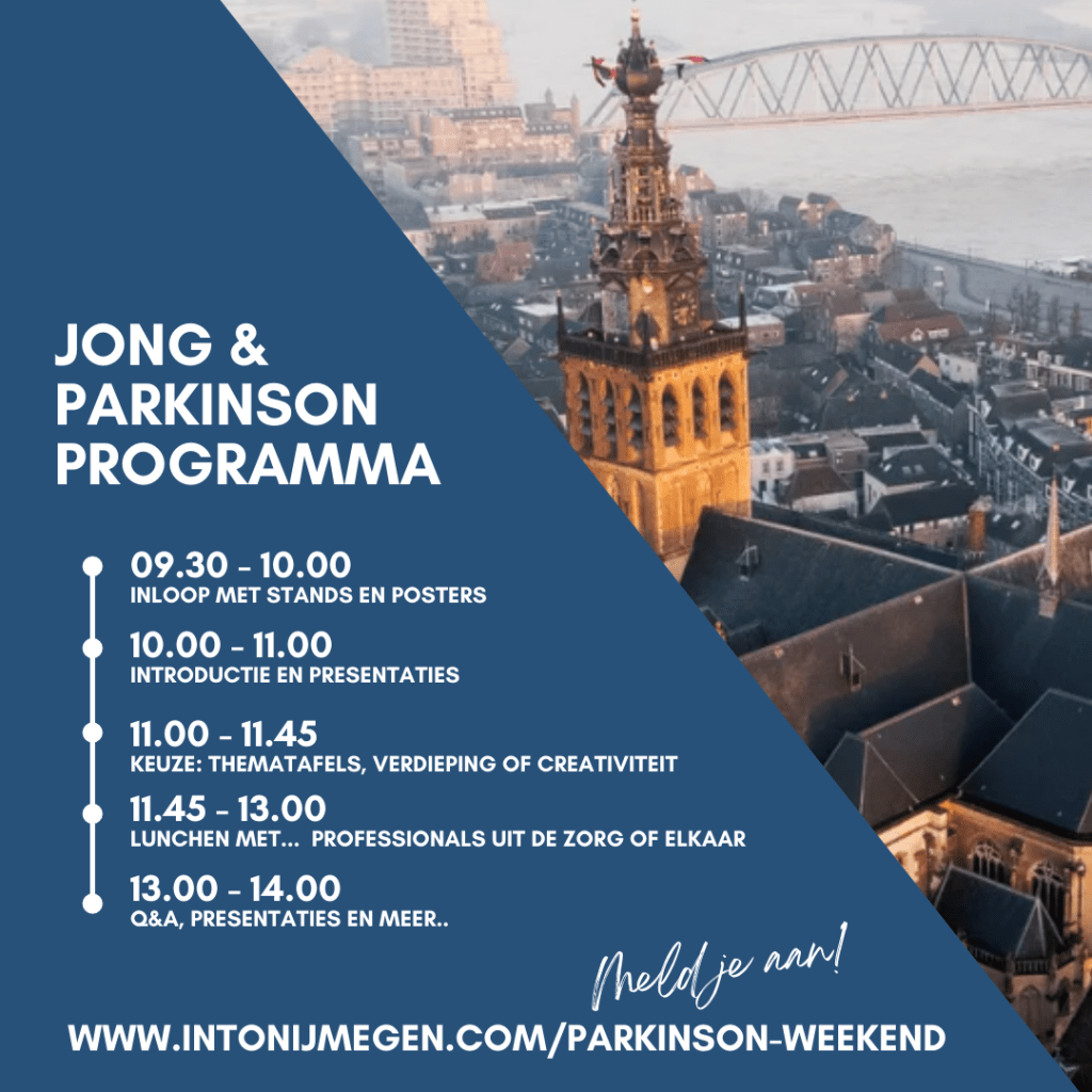 In het weekend van 22-24 september staat de stad Nijmegen volledig in het teken van de ziekte van Parkinson. Aanleiding voor het weekend is de NWO Stevinpremie die Parkinson-expert Bas Bloem en zijn team toegekend kregen. Tijdens het driedaagse weekend zijn er talloze activiteiten voor mensen met de ziekte van Parkinson, hun naasten en alle andere geïnteresseerden. Ook is er een speciaal programma voor kinderen.