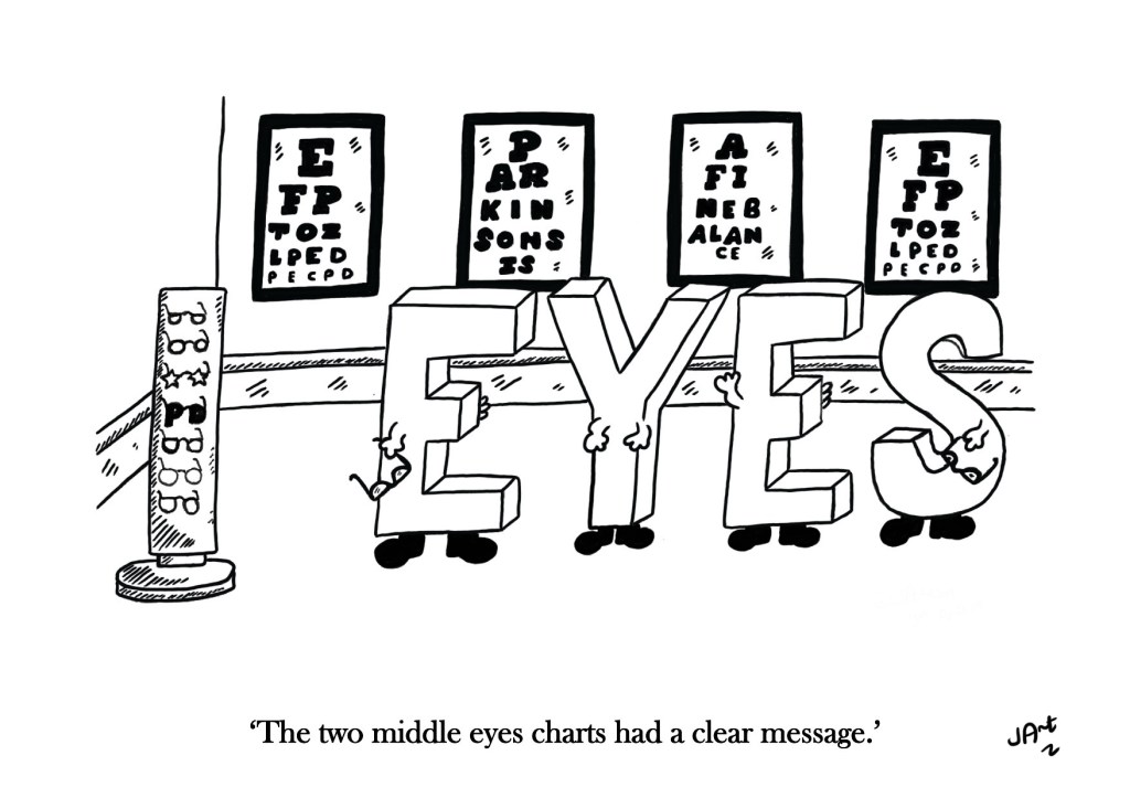 “Bij ons Parkinsonians kunnen de ogen, door het te weinig knipperen, droger worden waardoor we in combinatie van dichtbij-veraf troebel kunnen gaan zien. Daarbij kunnen we ook door de medicatie wazig gaan zien. Bespreek dit altijd met uw huisarts, neuroloog of Parkinsonverpleegkundige en laat uw ogen controleren bij de oogarts. Veelal schrijft die oogdruppels voor met een zoutoplossing zodat uw ogen niet te droog zijn. Maar ook kunnen we oogproblemen krijgen die anders van aart zijn bij Parkinson of de medicatie van Parkinson. In dat geval zal de oogarts u doorverwijzen naar Koninklijke Visio of Bartiméus”.