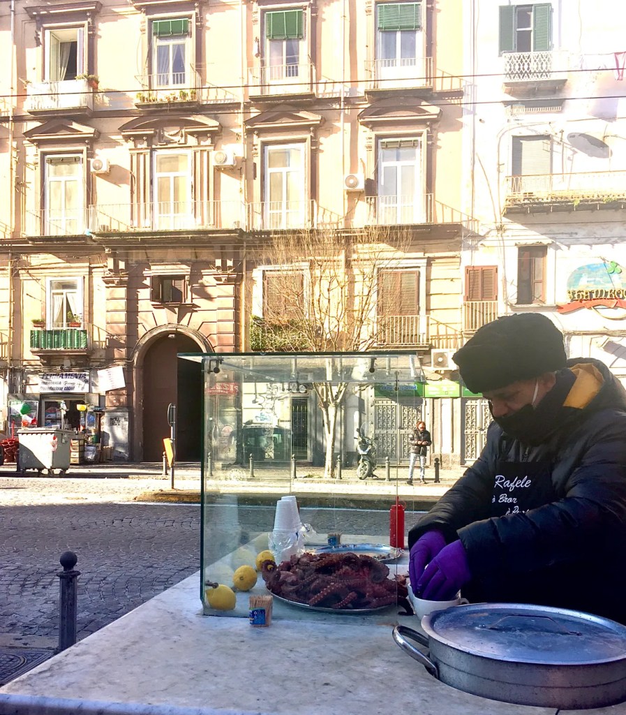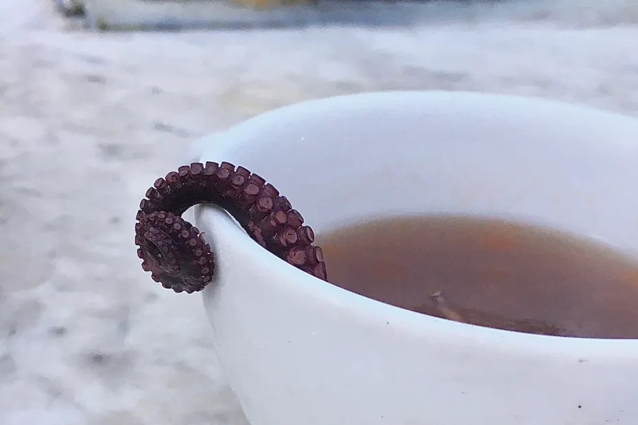 Bij het bestellen van je bror’ ‘e purp’ wordt een klein voorverwarmd theekopje gevuld met de hete bouillon, en om het af te maken worden er mooie paarse ranfetelle toegevoegd: heerlijke stukjes tentakel. Voeg de optionele citroenwig en forte/rosso (chili-olie) toe en je kopje troost is klaar om naar binnen te gaan (van de octopus zelf kan je natuurlijk heerlijke gerechten maken zoals Polpo con patate / Octopus met aardappels of Spaghetti con polpo e salsa di pomodoro / Spaghetti met octopus en tomatensaus, dit recept klaarmaken duurt drie en een half uur totaal, dus vroeg beginnen)