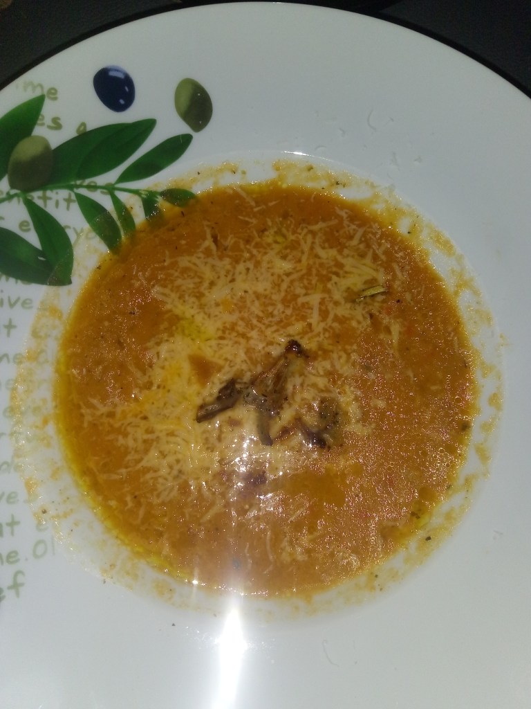 Verwarm de oven voor op 200 gr. Ontdoe de paprika’s van de zaadlijsten en grill deze op hoogte in de grill totdat het vel begint te verkleuren, de paprika zacht is. Daarna pel je de knoflook en plet deze, schil de uien en snij in stukken. Haal het buitenste schil van de venkel knol en snijd die ook in stukken van ongeveer 1-2 cm. Na de paprika grill je de andere groente onderin de oven totdat deze ook beginnen te verkleuren. Houd wat stukjes venkel over als garnering. Zet ondertussen de groentebouillon op een laag vuurtje en laat licht koken. Als alle groente gegrilld zijn doe je ze met peterselie (mag verse zijn fijngesneden, mag ook droog uit de pot), Italiaanse kruiden en de vleestomaat in stukken bij de bouillon. Laat alles goed doorkoken en pureer met de staafmixer tot een gladde massa. Laat op zacht vuur rustig door pruttelen en doe er extra vergine olijfolie bij. Doe desgewenst nog peterselie toevoegen. Als je crostini wilde maken kan je dit nu mooi doen. Terwijl je dit doet laat je de soep rustig op laag vuur staan. Als de crostini of stukken stokbrood klaar zijn doe je een ruime hoeveelheid Parmezaan door de soep en dien direct op. Op het bord kan je nog garneren met peterselie en Parmezaan.