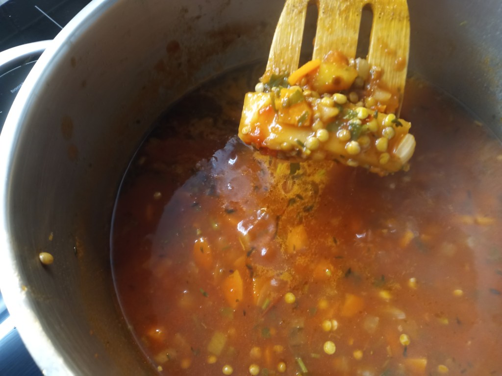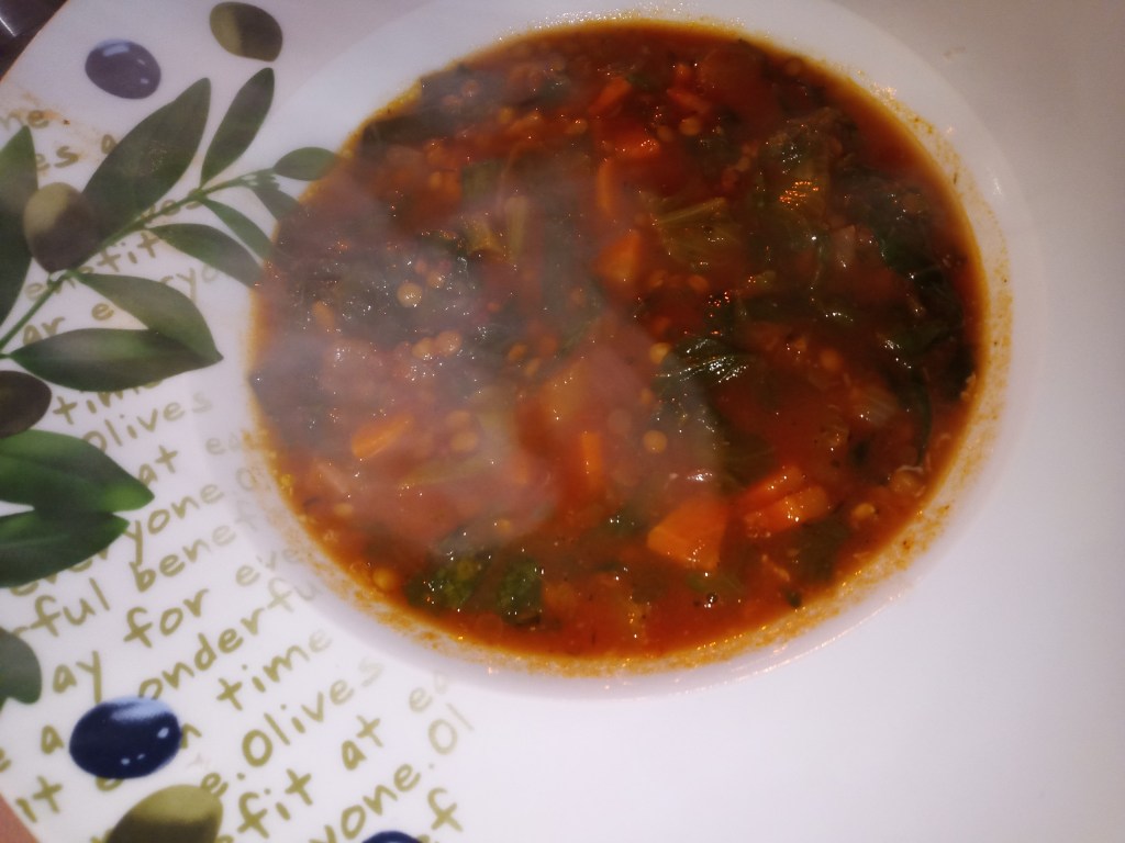 2 el olijfolie, 1 kleine ui gesnipperd, 1 grote wortel in kleine stukjes, 3-4 knoflooktenen fijngehakt, 1/4 tl chilivlokken, 1 blik tomatenblokjes of passata, 250 ml groene linzen, tijm, 1 laurierblad, verse peterselie, de korst van Parmezaanse kaas, 1,5 liter groentebouillon, zout en peper, 1 kleine krop andijvie, grof gesneden of een zak andijvie, geroosterd brood